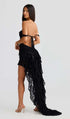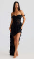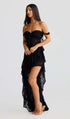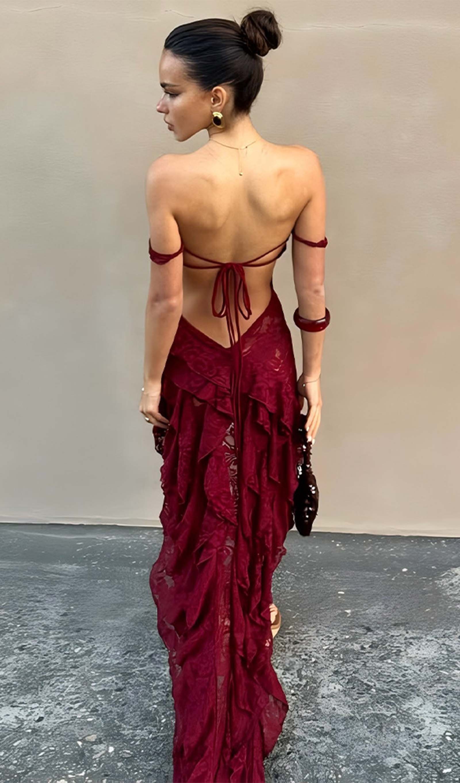 Bordo Renkte Asimetri Etek Ucu Dantelli Fırfırlı Elbise