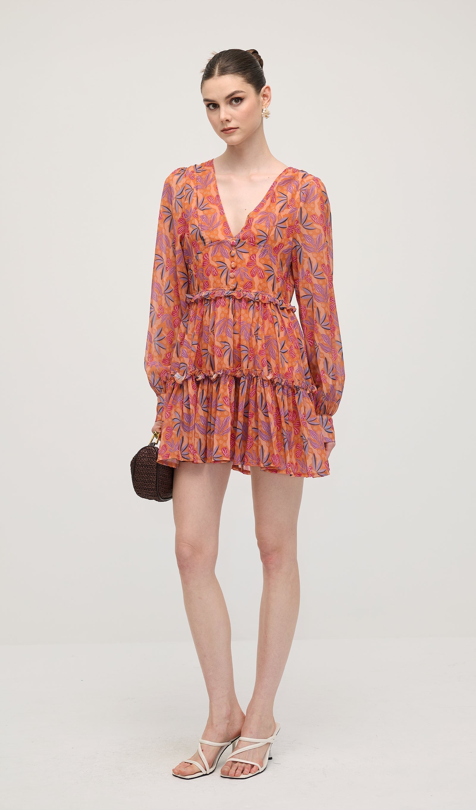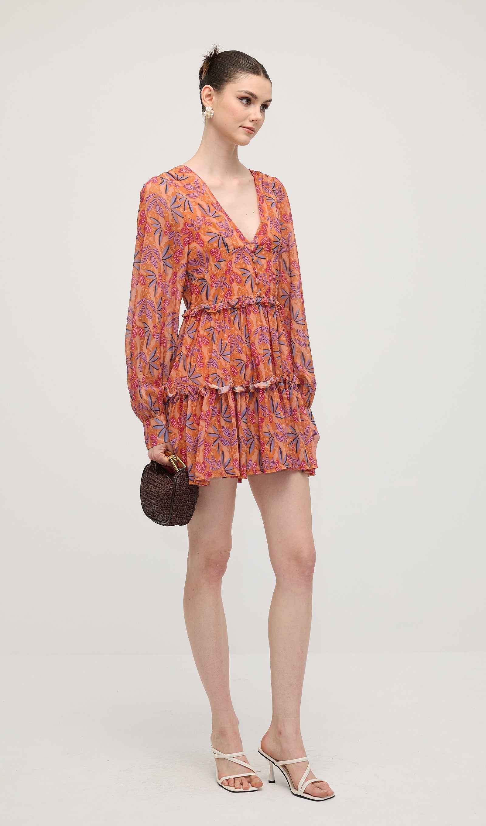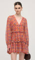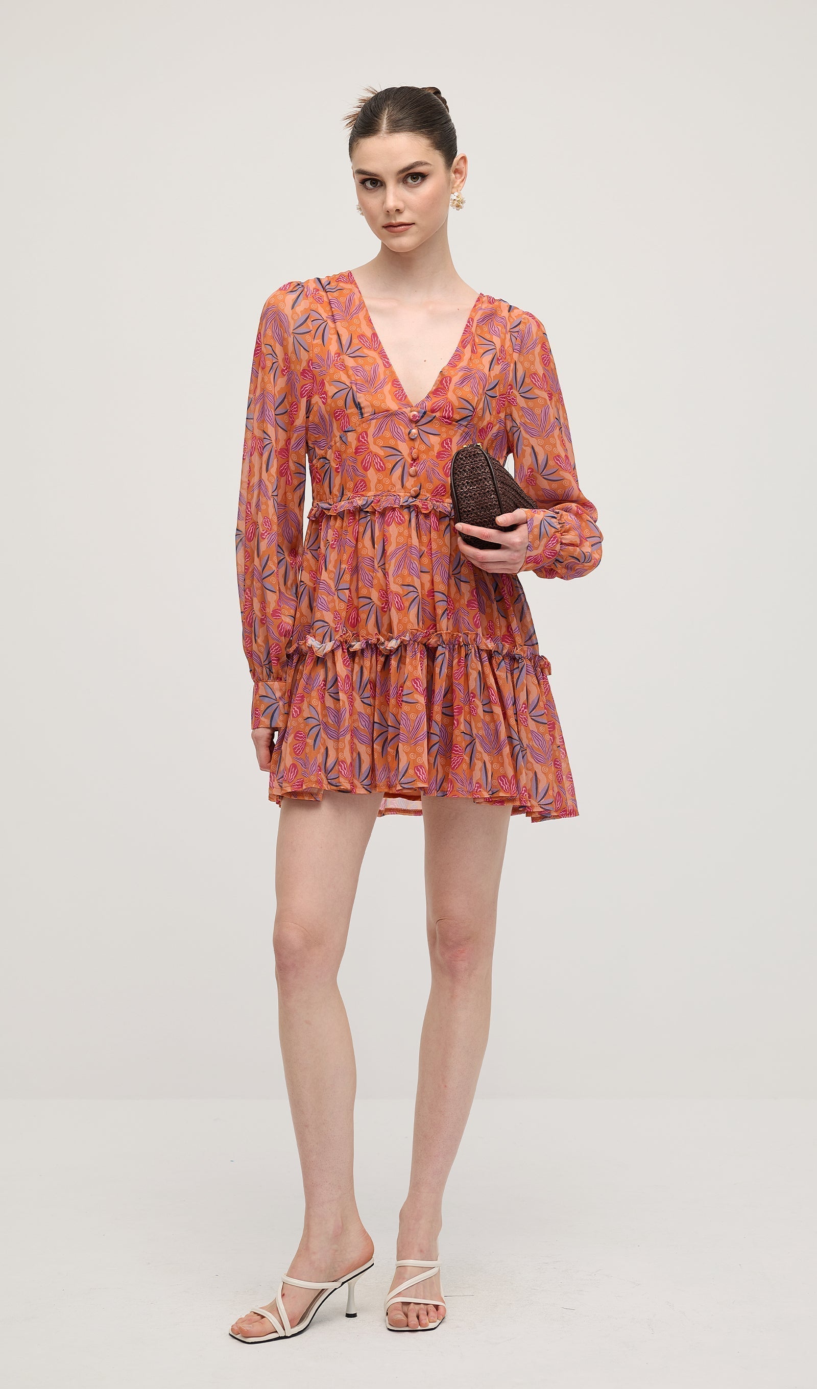 Çiçek Desenli V Yaka Fener Kollu Mini Elbise