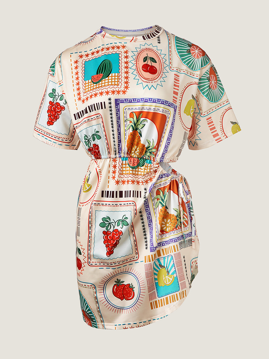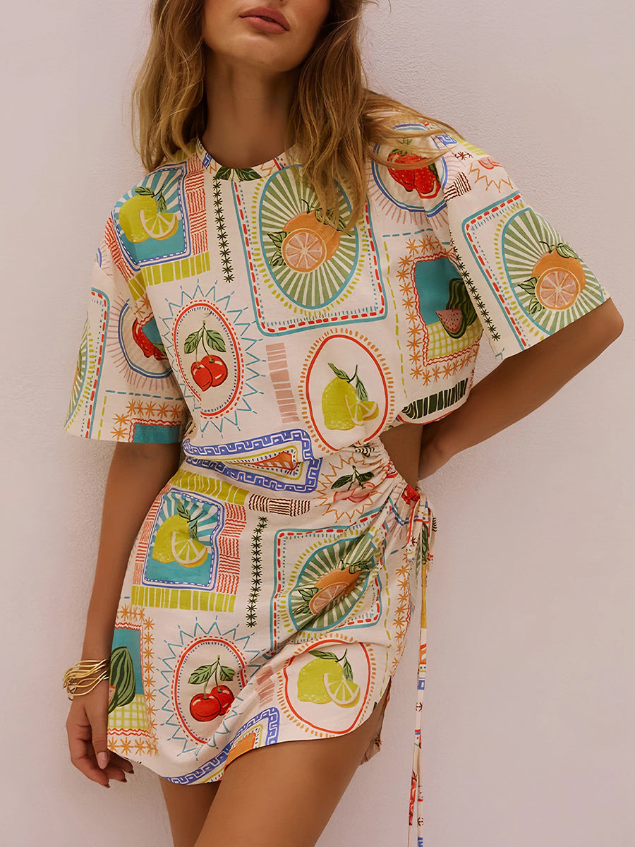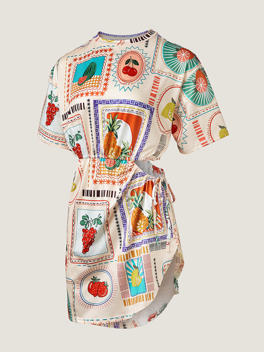 Meyve Baskılı Kısa Kollu Kesik Mini Elbise