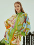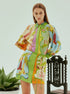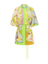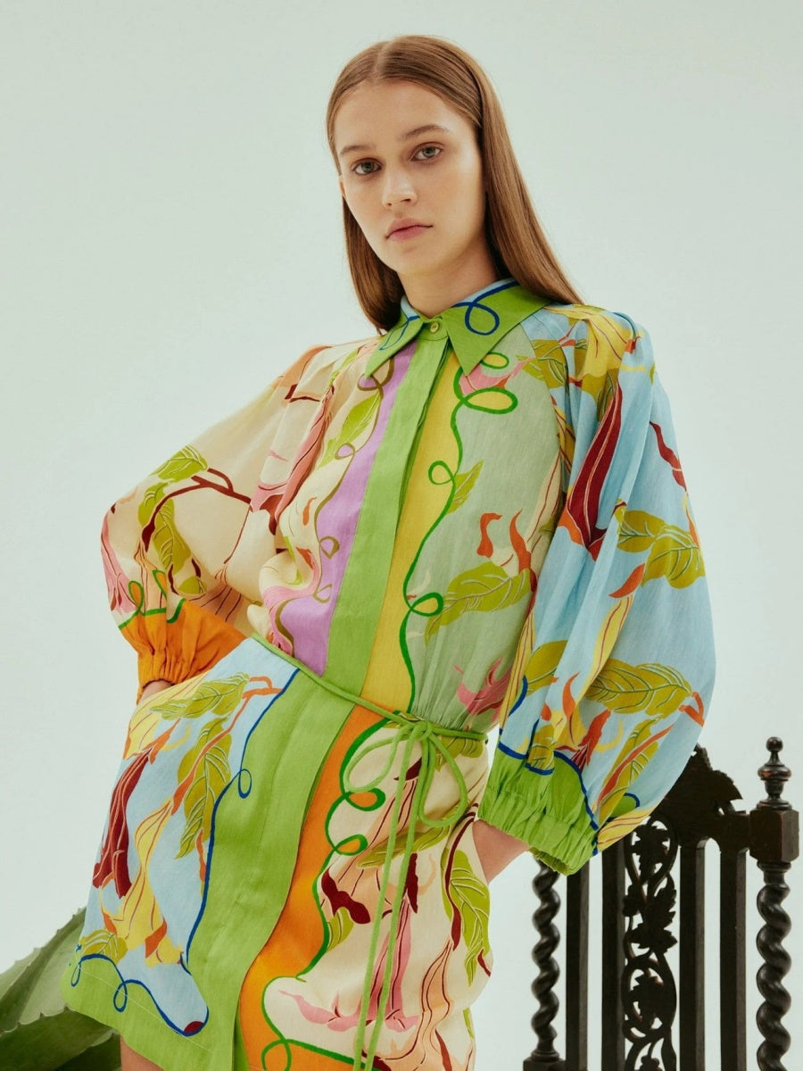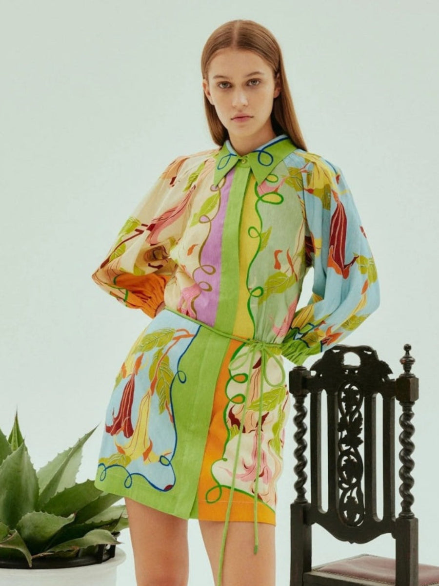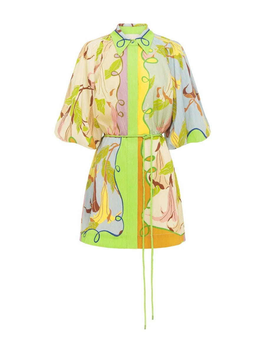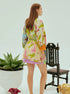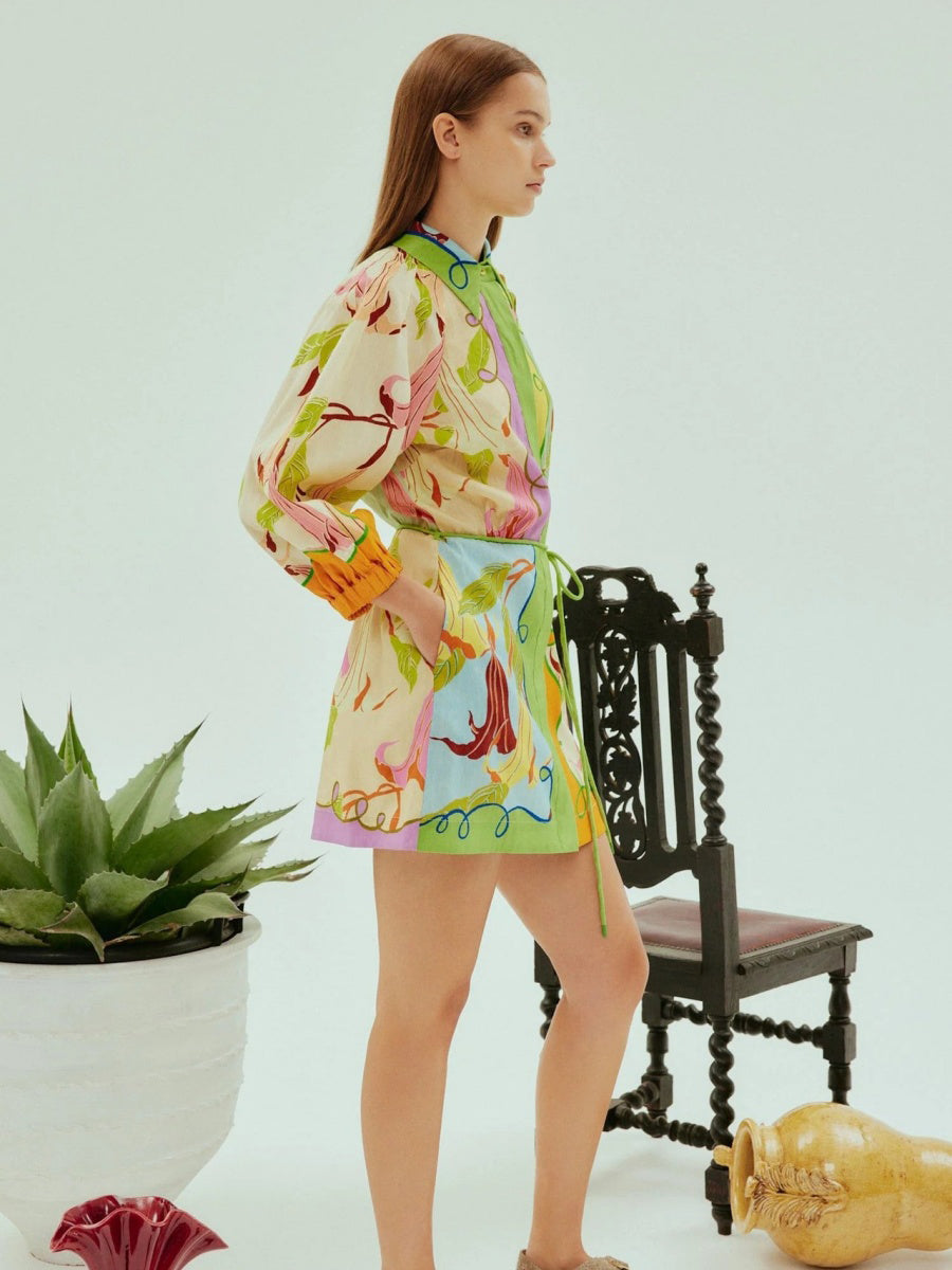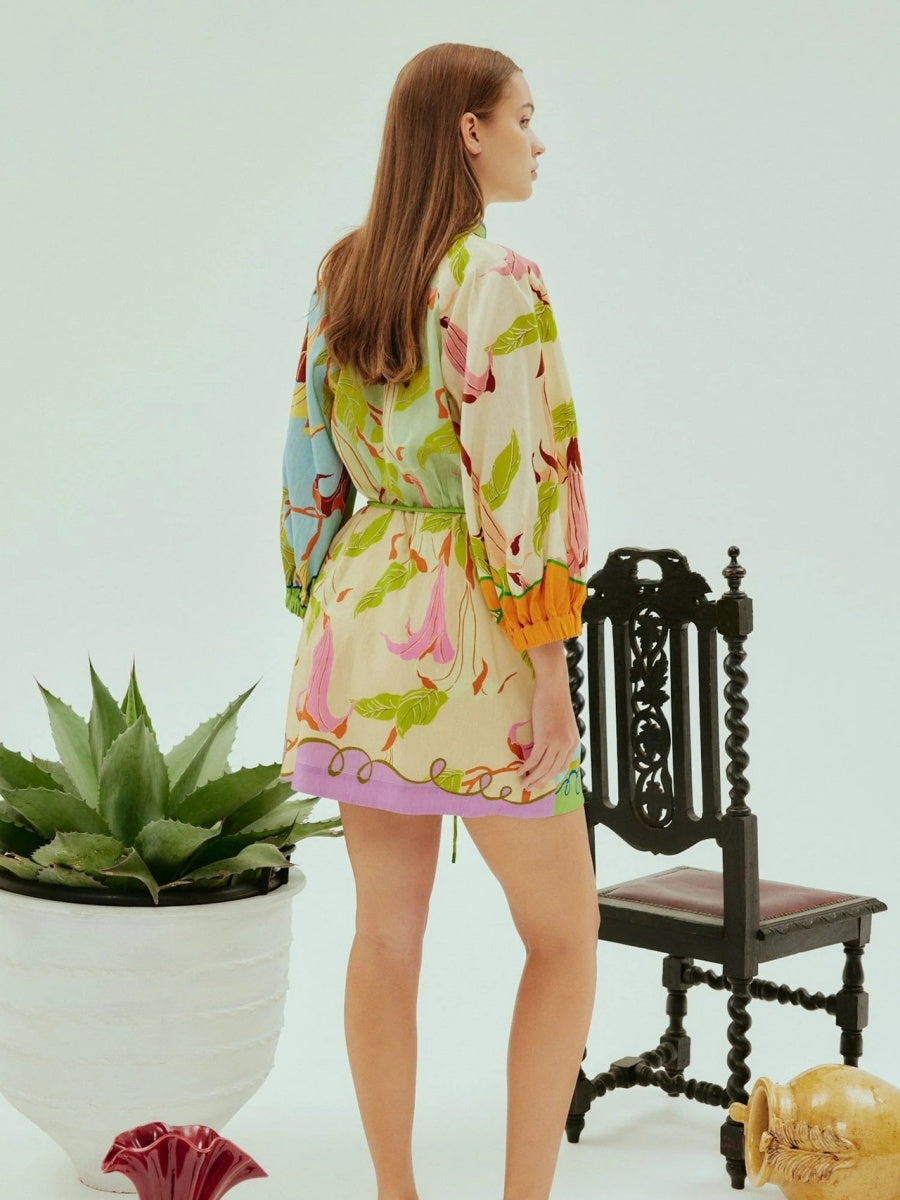 Yaprak Desenli Puf Kollu Bağcıklı Mini Elbise