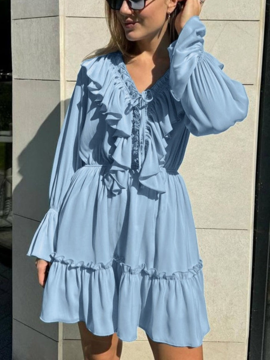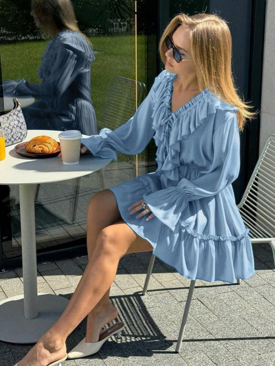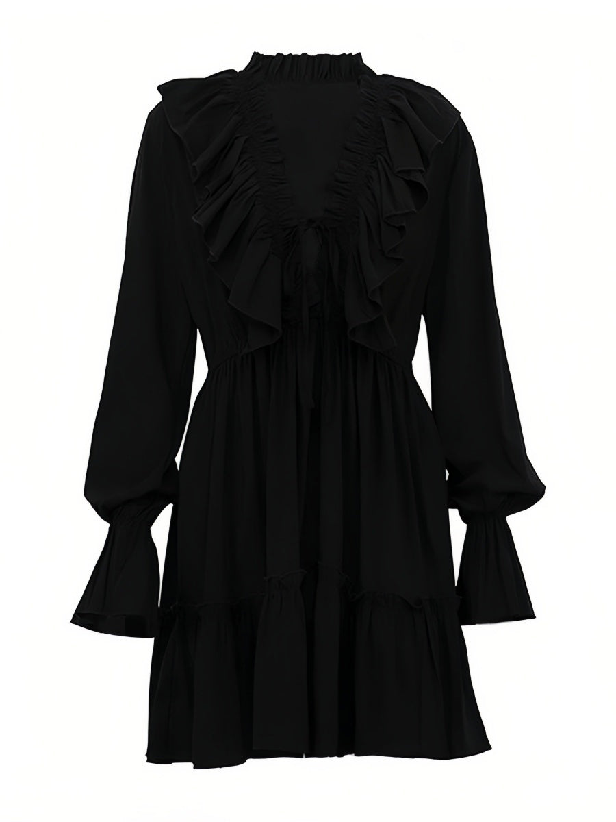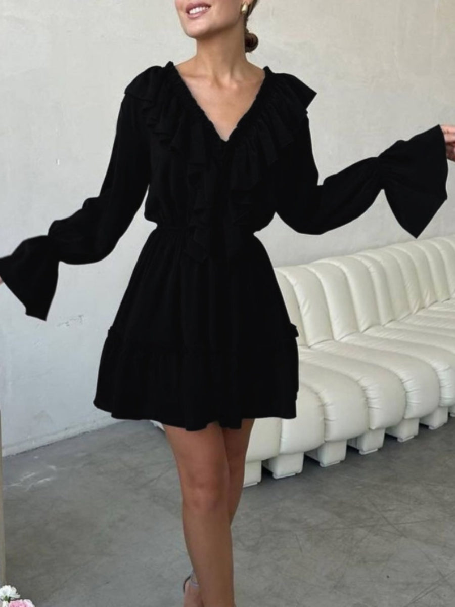 Volanlı V Yakalı Kloş Kollu Mini Elbise