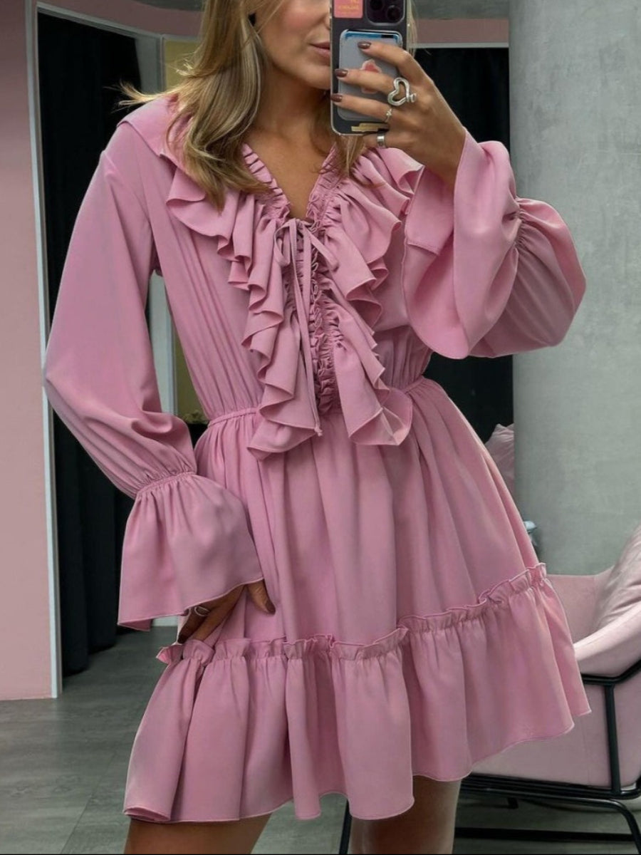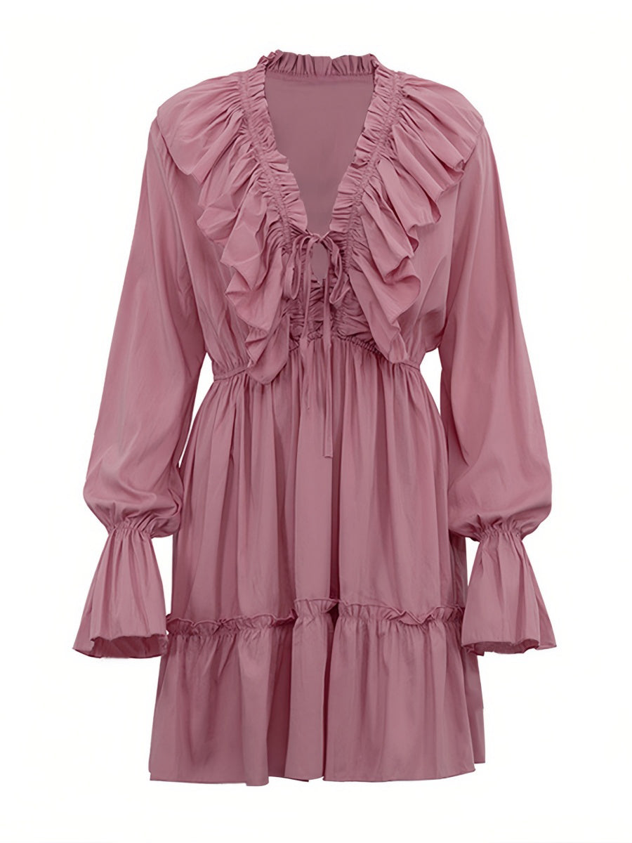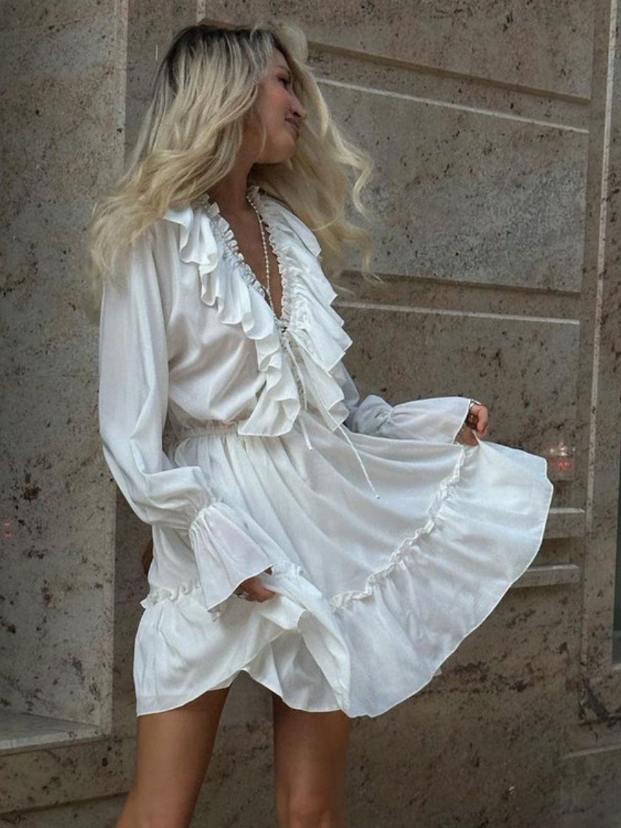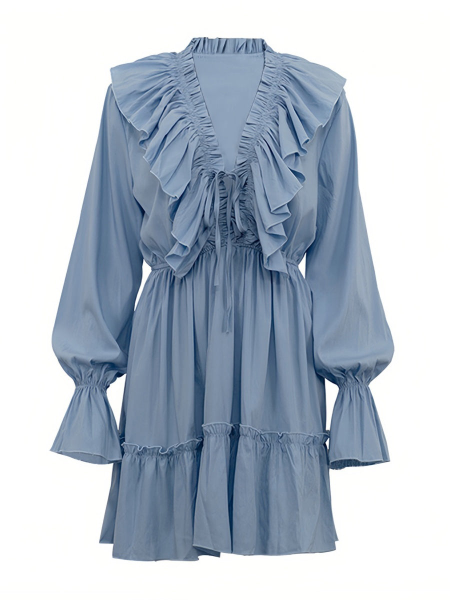 Volanlı V Yakalı Kloş Kollu Mini Elbise